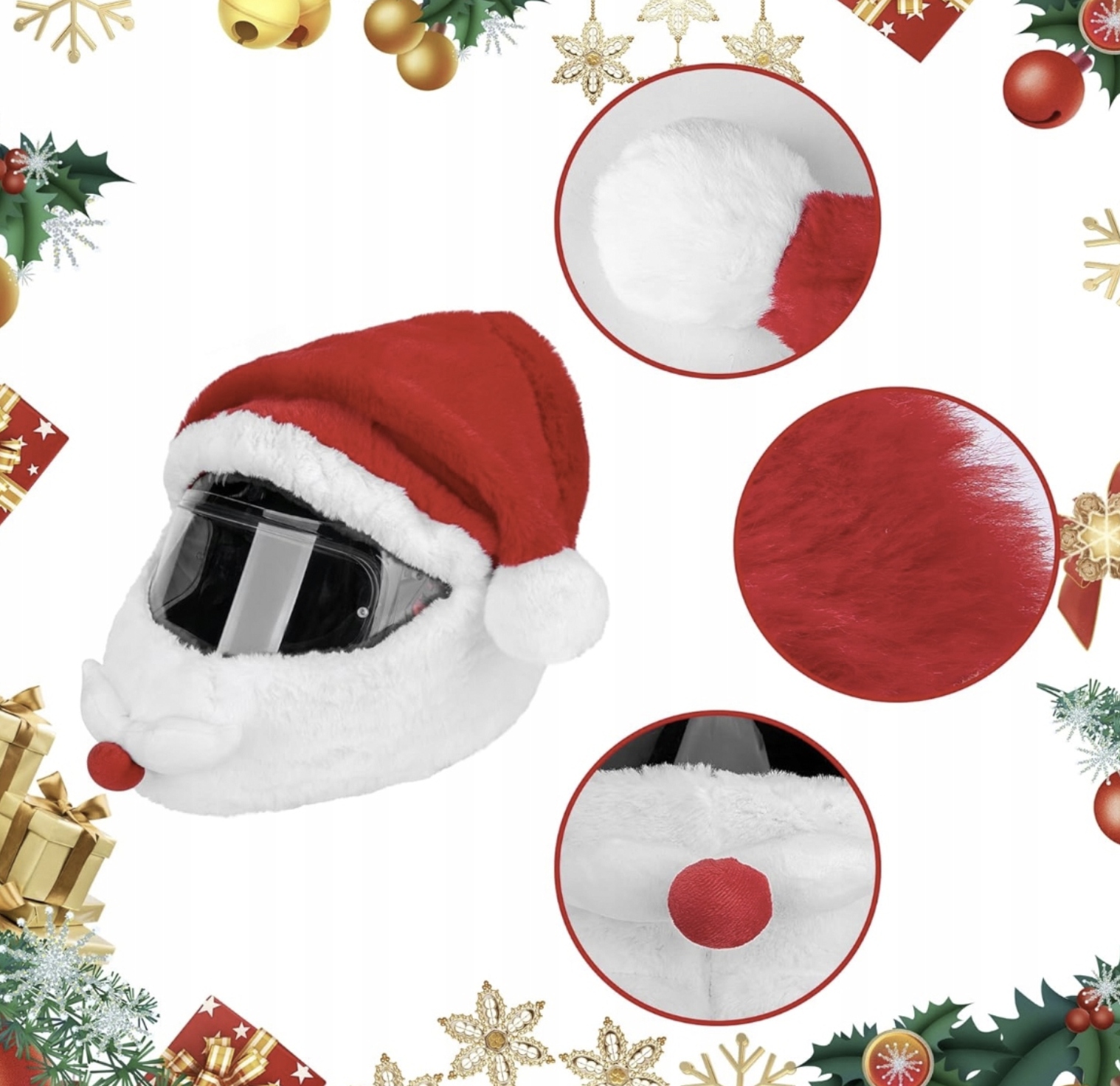 Nakładka na kask motocyklowy w formie czapki Świętego Mikołaja wyróżnia się unikalnym, zabawnym designem, który zwiększa widoczność na drodze i poprawia bezpieczeństwo. Jest łatwa w montażu, chroni kask przed zabrudzeniami i zarysowaniami, a dzięki elastycznej gumie oraz dodatkowym zapięciom, pozostaje stabilna nawet przy większych prędkościach.