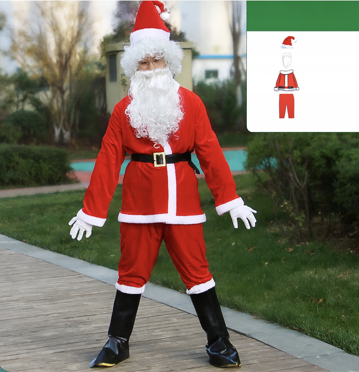 • KOMPLETNY ZESTAW PREMIUM 5w1: Nie musisz niczego dokupować! Nasz zestaw zawiera wszystko, co potrzebne do stworzenia pełnego wizerunku Mikołaja.
